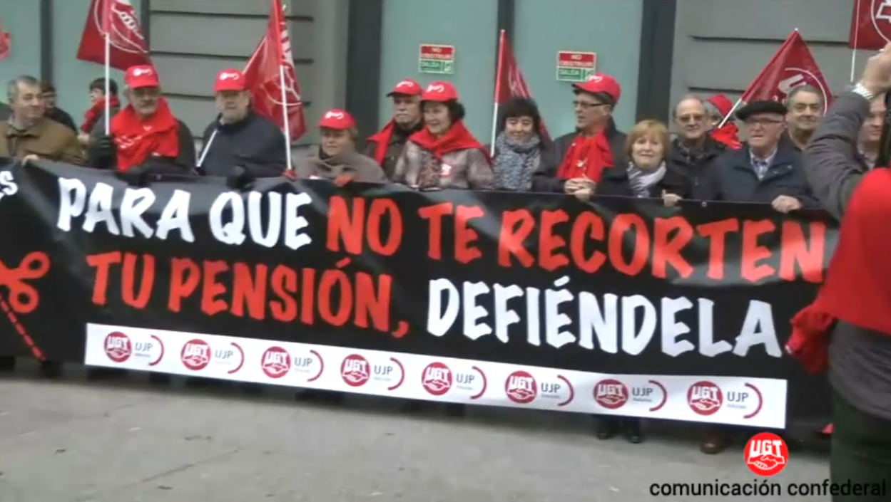 UJP-UGT se concentra frente al Congreso para exigir la revalorización de las pensiones y rechazar el veto del Gobierno a la proposición de ley de la mayoría de grupos parlamentarios.